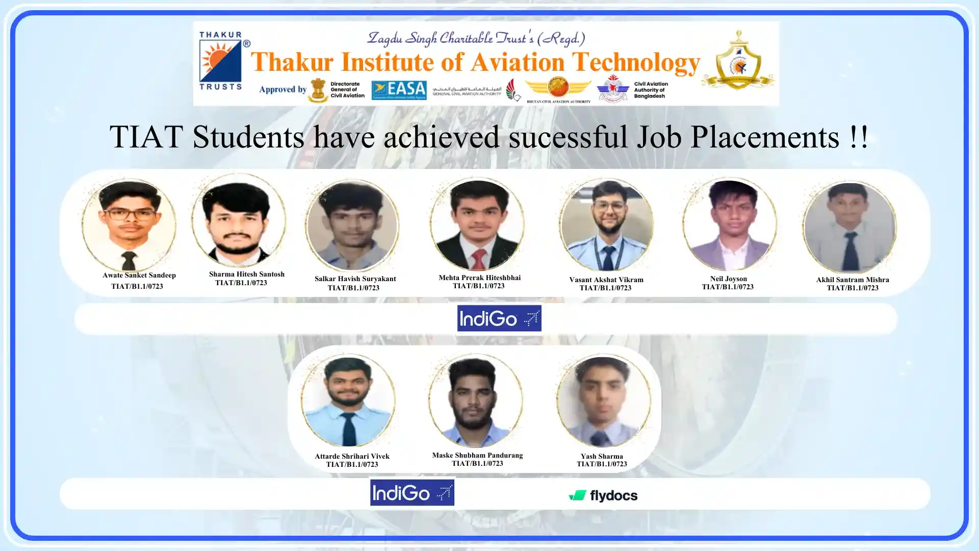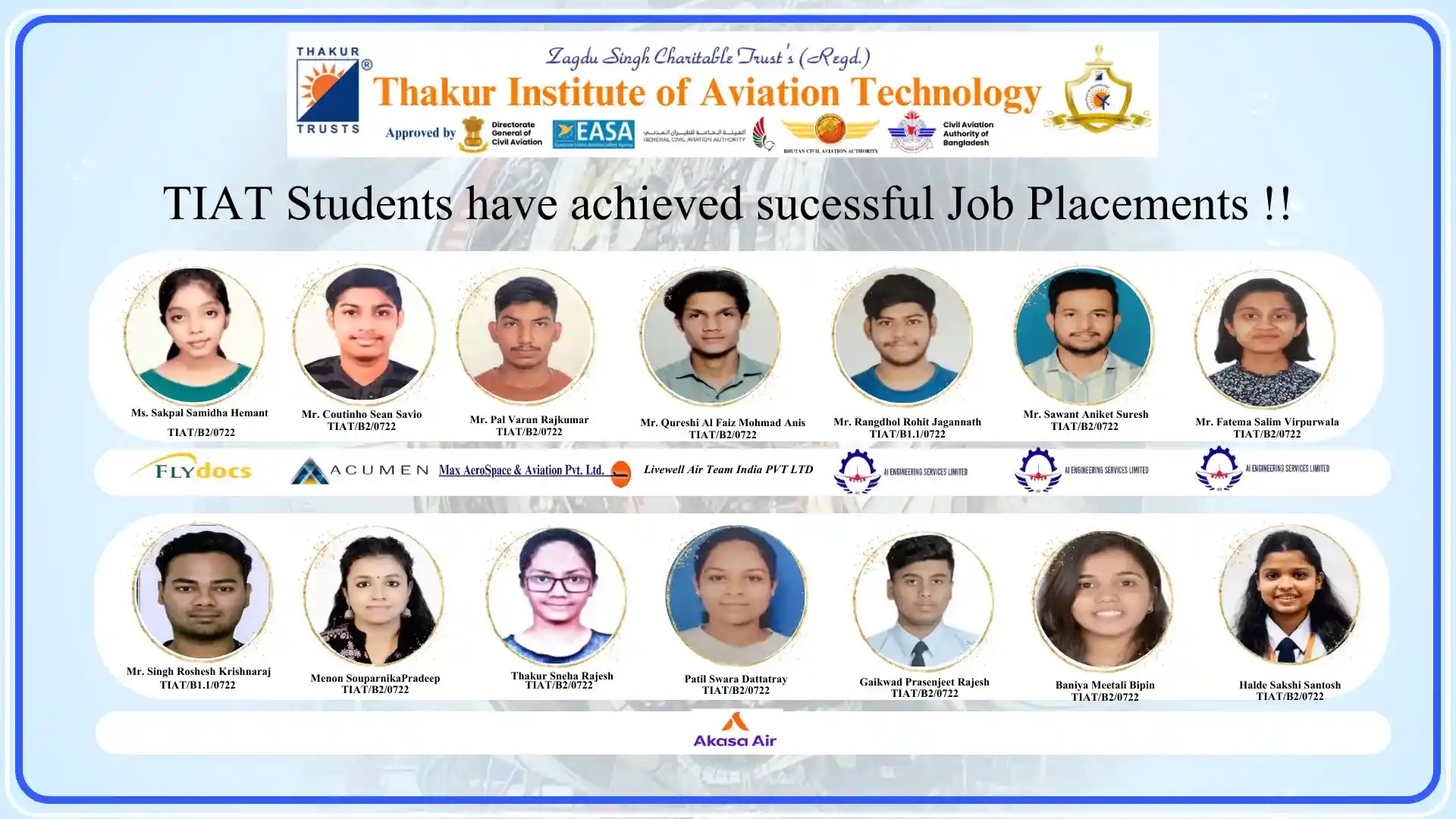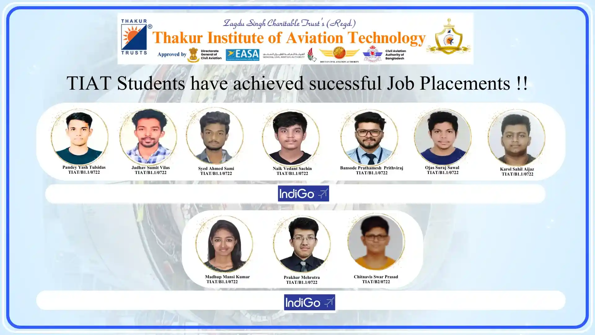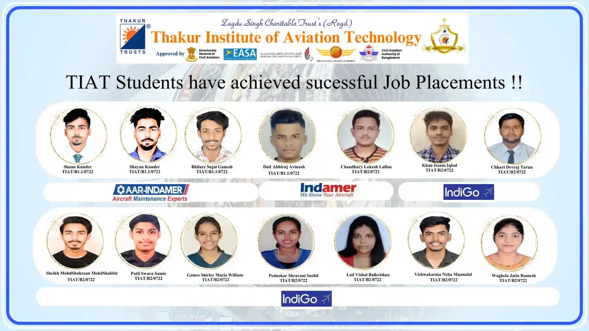 Thakur Institute of Aviation Technology (TIAT) has achieved remarkable success in placing talented Aircraft Maintenance Engineering (AME) students in leading aviation organizations. Our commitment to providing quality education and industry-relevant training has resulted in excellent career opportunities in the aviation industry.