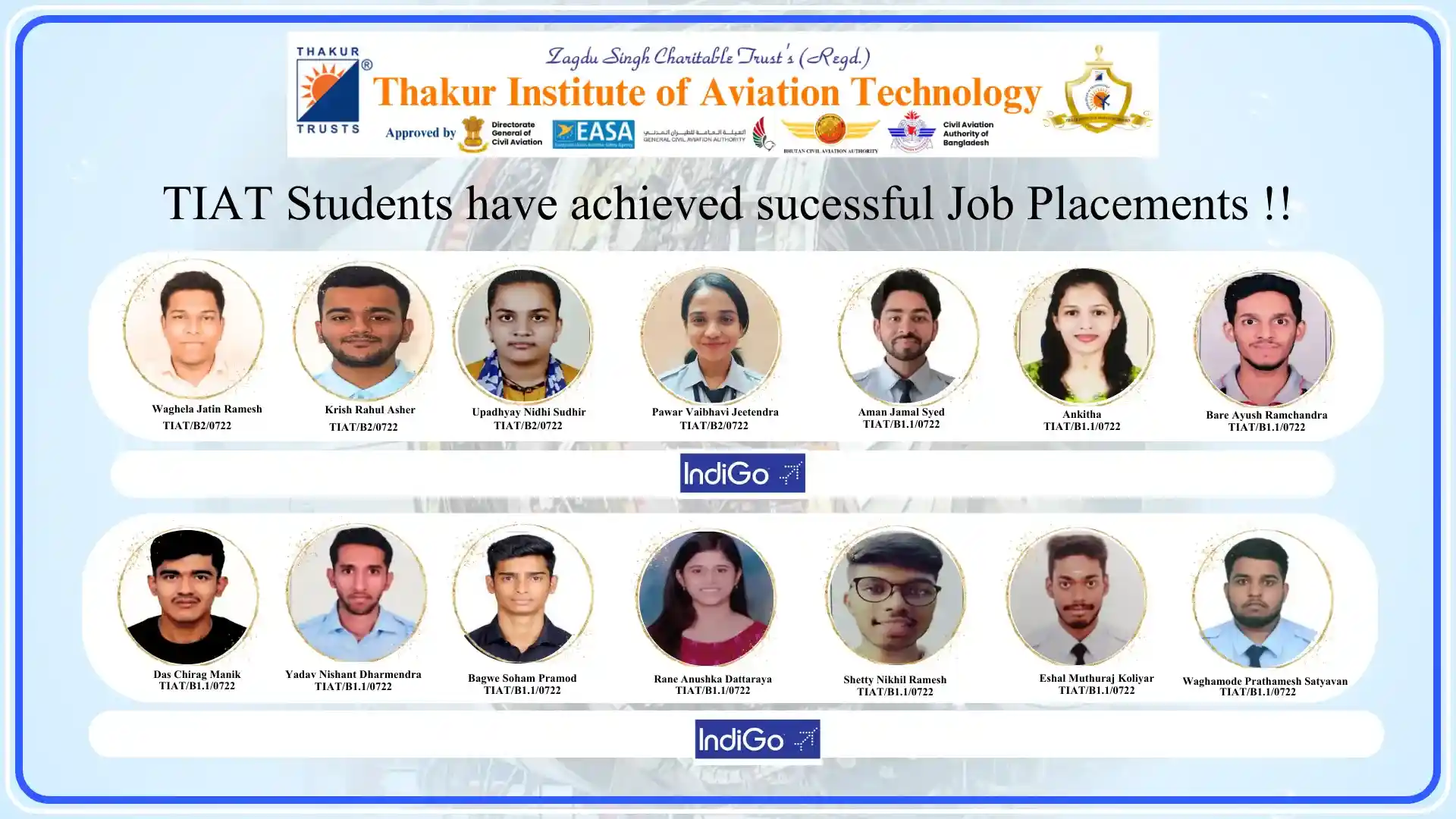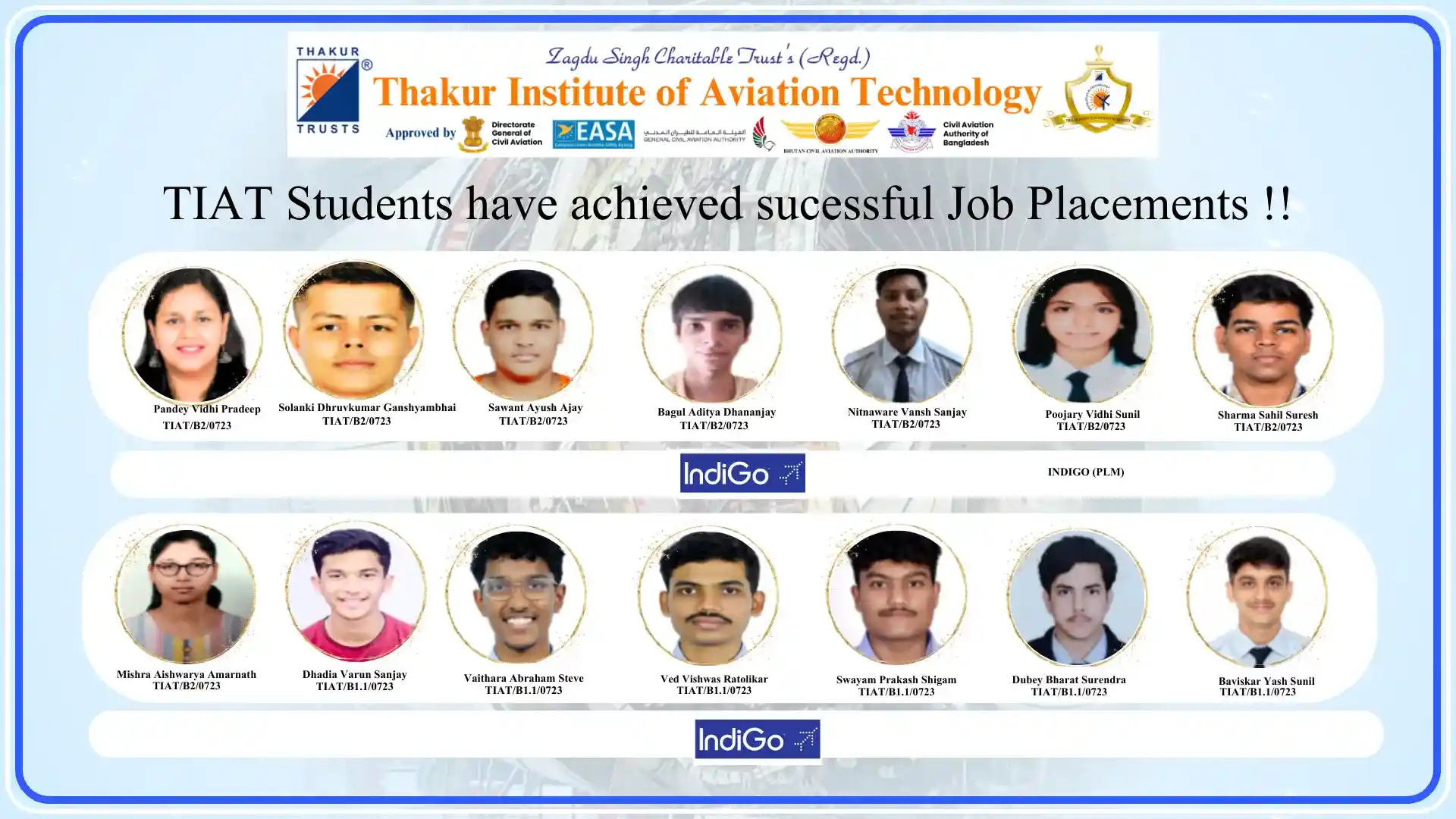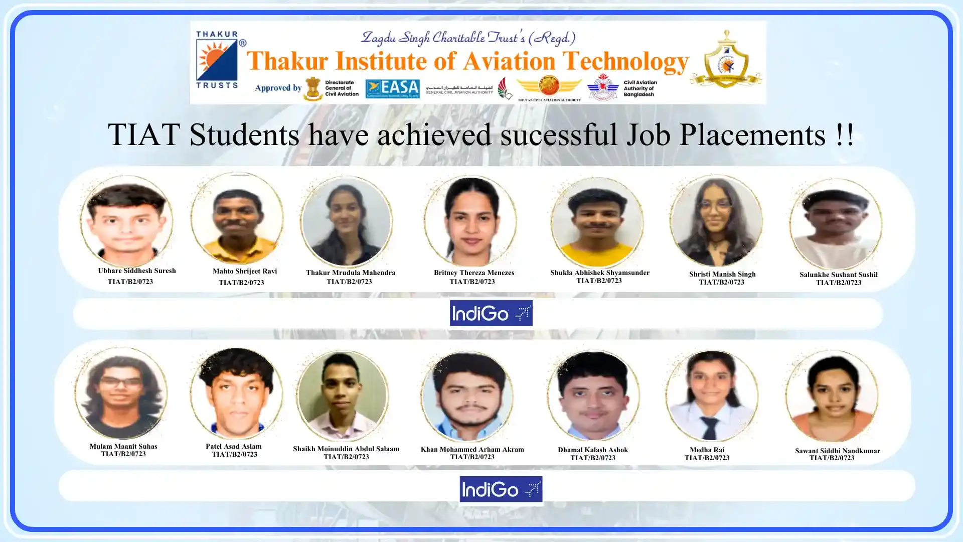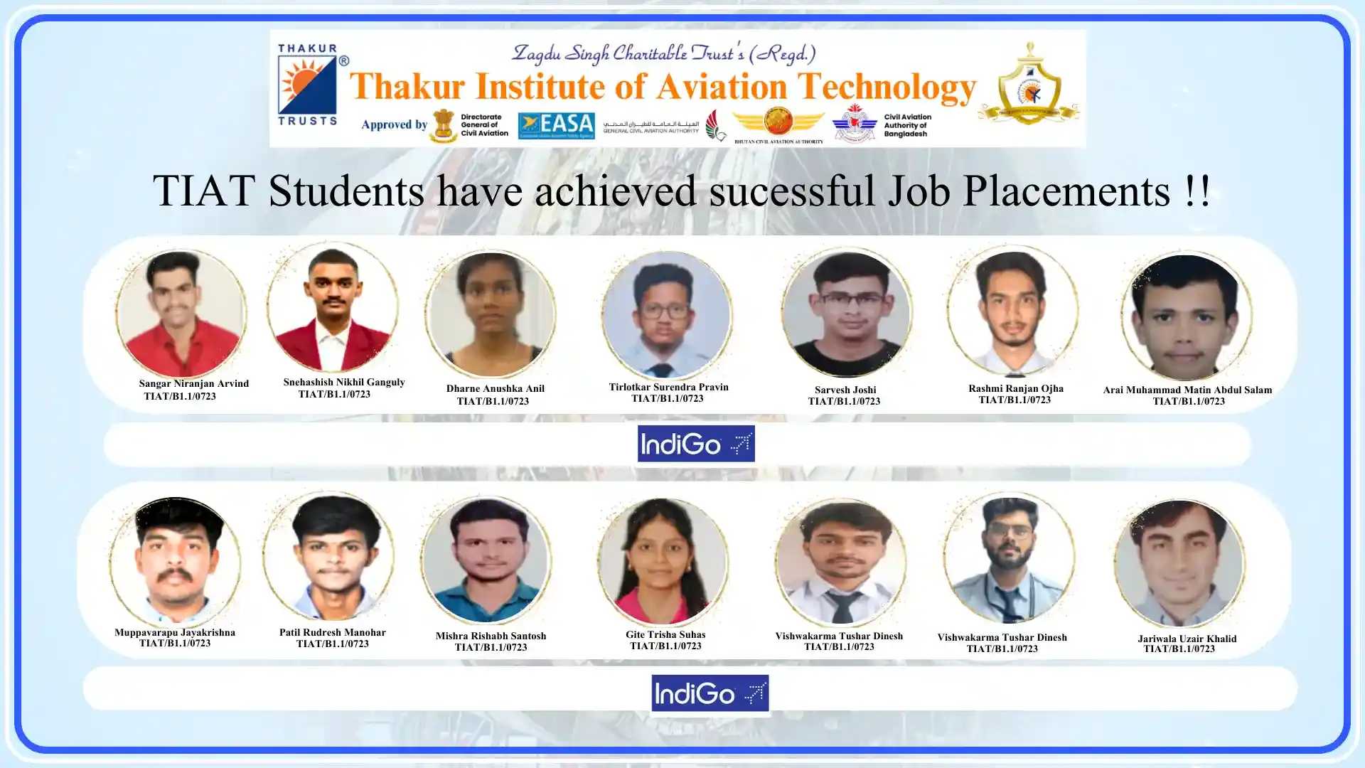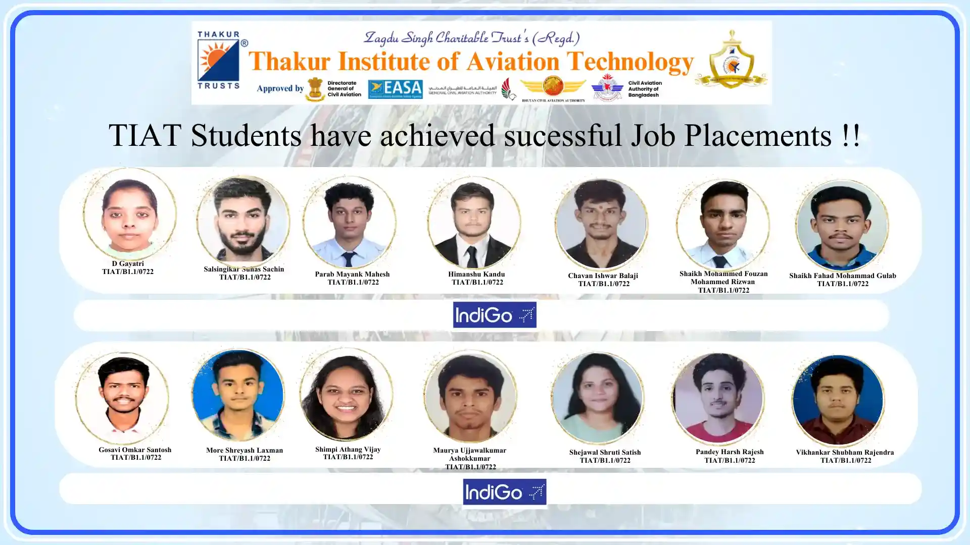 Thakur Institute of Aviation Technology (TIAT) has achieved remarkable success in placing talented Aircraft Maintenance Engineering (AME) students in leading aviation organizations. Our commitment to providing quality education and industry-relevant training has resulted in excellent career opportunities in the aviation industry.